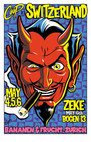 AusstellungKlang und Kleid präsentiert in der Lokalität "Bananen & Frucht" in Zürich-West am Samstag 4. Mai ab 19 Uhr den aus Bixby, Oklahoma stammenden Künstler Chris Cooper, besser bekannt unter dem namen COOP. Er wird sein neustes Buch "DEVIL`S ADVOCATE" The Art of COOP (Aperient Press ISBNSeit bald 10 Jahren zeichnet der heute 33 jährige COOP für die amerikanische Garage-Rock n'Roll Punkszene sowie das "Lowbrow" Artmovement Californiens. Eine klassische Ausbildung hatte er nie absolviert, sondern ein Job in einer Siebdruckbeschriftungsfirma hat Ihn dazu bewegt, für befreundete Punklabels und Bands, Plattenhüllen, Konzert und Tourplakate zu gestalten. In den ersten Jahren zeichnete er vorallem in schwarz/weiss da er farbenblind ist und perfektionierte so seinen Strich. Als er Robert Williams, sein grosses Vorbild kennenlernte fing er an in Farbe zu arbeiten, in Oel- und Acrylbildern sowie Siebdruckplakaten. Seine Inspirationsquellen sind vielseitig: die Pop Art eines Roy Lichtenstein oder Mel Ramos, die amerikanische Comickultur, explizit das Mad Magazine, das Tattoogenre generell (COOP hat sich am Oberarm mit einem Portrait von Alfred E. Neumann als Beatnik tätowiert :-), Zeichner wie Jack Davis, Don Martin, Georg Woodbridge und Wally Wood. Weitere Quellen sind die Hot Rod Szene (er besitzt einen 1950 Ford Deluxe Club Coupe), Ed Roth's Modelkitabbildungen, der "Ratfink", Zitate aus B-Movies des Horror-, Hammer- und Sciencefictiongenres und läppische Fernsehserien. Und stehts sind auch starke Weibsbilder mit grossen Titten und schwächlichen Männern als Gefährten ā la Russ Meyer omnipresent. COOP hat so einen Weg gefunden neue Symbole und klassische Figuren für die amerikanischen Populärkultur zu kreieren. Er vergleicht dies in einem Interview mit dem was die Ramones erreicht haben. Diese sind eigentliche Karikaturen einer Rock n'Roll Band geworden und ihre Musik ist so genial weil sie so simpel ist. In diesem Sinne Hey Ho Let's Go... be outta here. KonzertZEKE, ist eine vierköpfige Band aus dem Nordwesten Amerikas. Eine weitere Seattle Kappelle? Wohl kaum... mit ihrem ultra high-speed Rock n'Roll, stehen sie da eher im Abseits und berufen sich lieber auf Einflüsse wie Motorhead, Ted Nugent und Judas Priest. Häufig werden sie auch im gleichen Atemzug mit den Dwarves und den Murder City Devils genannt. Die Songs über Satan, V8 Motoren, Horrorfilme, Drogen und Frauen sind selten länger als 90 Sekunden und durchbrechen jegliche Geschwindigkeitsbegrenzungen. 1993 wurde die Band von Sänger/Gitarrist Blind Marky Fletchtone gegründet und hat bisher 5 Alben veröffentlicht: