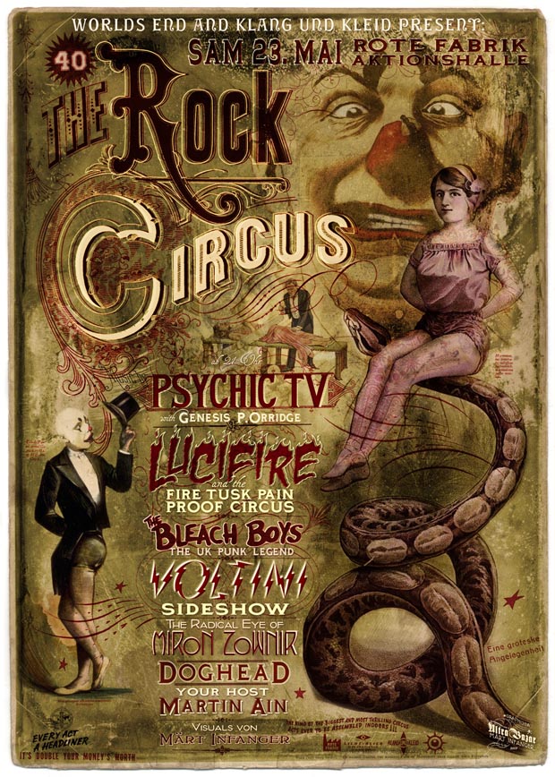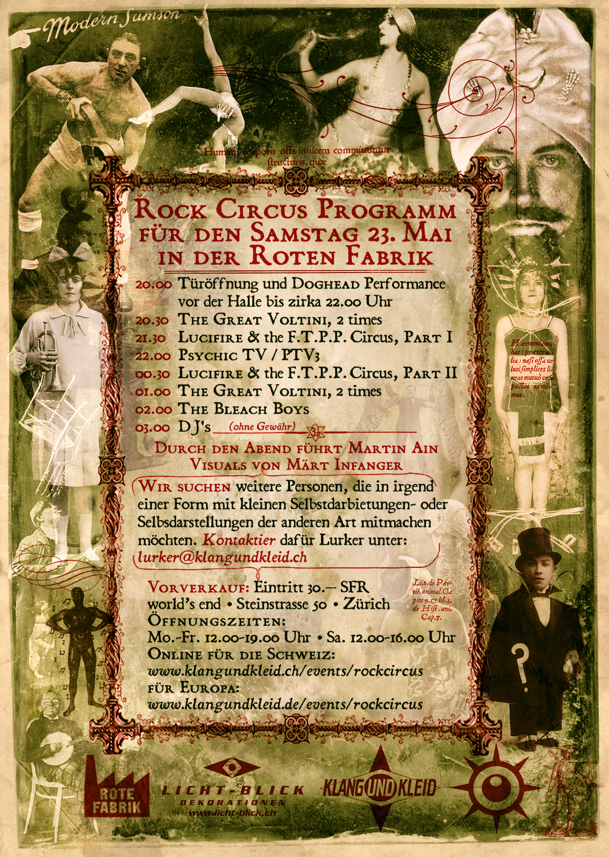 PresseNachfolgend einige der Bilder zum Rock Circus Event für die Verwendung in der Berichterstattung über den Anlass.Bitte beachten: Weitere Bilder und PR-Texte werden in Kürze hier noch aufgeschalten... BilderFlyer Front (JPG, 683 KB)Flyer Back (JPG, 2753 KB) Genesis P Orridge (JPG, 690 KB) Genesis P Orridge - Album Review (DOC) (207 KB) Bleach Boys Schriftzug (JPG) Voltini - Beast Crop (JPG, 128 KB) Voltini - Climax Clear (JPG, 230 KB) Voltini - Nurse Electra (By Andre Wirsig) (JPG, 508 KB) Voltini Cartoon (JPG, 766 KB) Rock - Terror - 1 (JPG, 1123 KB) Rock - Terror - 2 (JPG, 1072 KB) Fire Tusk Pain Proof Circus - 1 (JPG, 1931 KB) Fire Tusk Pain Proof Circus - 2 (JPG, 762 KB) Fotos vom Anlass© Copyright Miron ZownirMiron Zownir - 1 (JPG, 2153 KB) Miron Zownir - 2 (JPG, 1901 KB) Miron Zownir - 3 (JPG, 2013 KB) Miron Zownir - 4 (JPG, 1917 KB) Miron Zownir - 5 (JPG, 2026 KB) Miron Zownir - 6 (JPG, 2135 KB) Miron Zownir - 7 (JPG, 2126 KB) Miron Zownir - Selbstportrait 1 (JPG, 237 KB) Miron Zownir - Selbstportrait 2 (JPG, 869 KB) LinksNochmals alle Links und Infos zum ausgefallenen Programm in einer Übersicht: