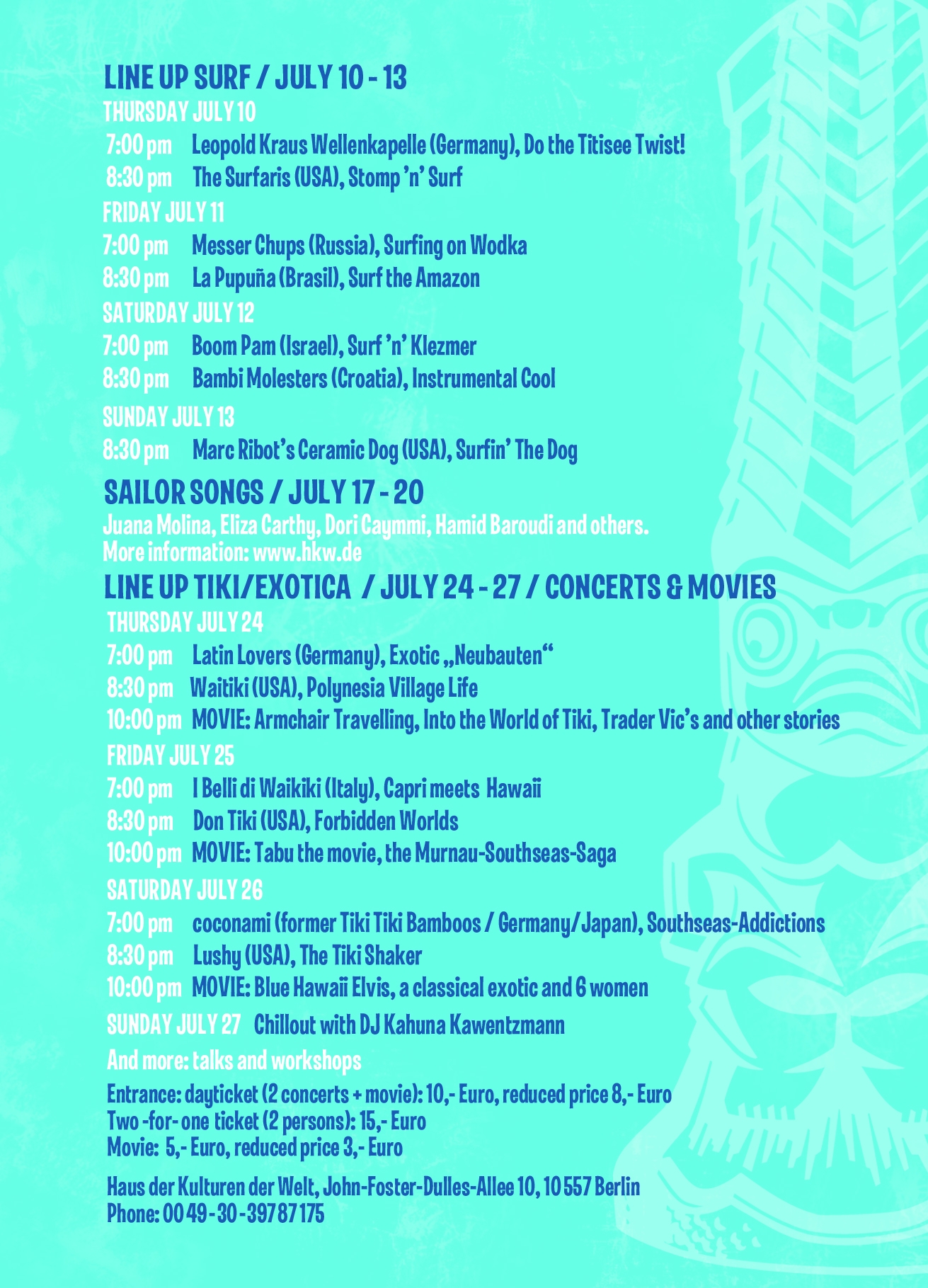 Seefahrerlieder / 17. - 20. JuliJuana Molina, Eliza Carthy, Dori Caymmi, Hamid Baroudi and others.Mehr Information: www.hkw.de Line Up Surf / 10. - 13. Juli